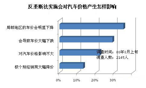 大多數(shù)消費者認為《反壟斷法》的實施會導致汽車價格的明顯下降。其中,35%的消費者認為局部地區(qū)的車價會明顯下降,另有29%的消費者認為會導致整體車價的大幅下跌!斗磯艛喾ā啡∠讼拗瓶鐓^(qū)銷售,以往由于供需關系或者交通方面的影響各地區(qū)車價會有一定差異,但是由于廠家限制跨區(qū)銷售,消費者只能在當?shù)刭徺I汽車。取消該規(guī)定后,上海的消費者也可以到甘肅購買便宜車了,這樣局部地區(qū)的高價車也就很難出手,有利于壓低部分區(qū)域的過高車價。另外,《反壟斷法》取消了最低限價制度,只要經(jīng)銷商愿意就可以隨便降低車價,激烈的市場競爭可能會導致車價出現(xiàn)較大幅度的下跌。