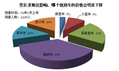 調查結果顯示,大多數(shù)消費者認為受反壟斷法影響高級車的市場價格會出現(xiàn)明顯下降。另有22%的消費者認為受影響緊湊型車的價格會大幅下降。目前市場需求量比較大的是緊湊型車和高級車,高級車的利潤空間相對較大,如果降價它的降價幅度也會相對較大。另外,高級車加價銷售的情況比較多,像之前的凱美瑞和新雅閣,新壟斷法實施后這種情況會逐漸消除。