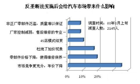 大多數(shù)消費者認為反壟斷法實施后會使得汽車市場競爭更充分,車價下降。近20%的消費者認為反壟斷法會導致汽車零部件價格下降,使得維修保養(yǎng)費用降低,另有部分消費者認為會杜絕加價售車現(xiàn)象。只有極少數(shù)消費者認為反壟斷法會帶來非正廠零部件泛濫質量難以保證,廠家控制減弱售后維修的專業(yè)性難以保證等弊端。一個法規(guī)的實施總會帶來好和不好的方面,但從調查來看,消費者對反壟斷法還是持比較樂觀的態(tài)度,認為它帶來的利大于弊。