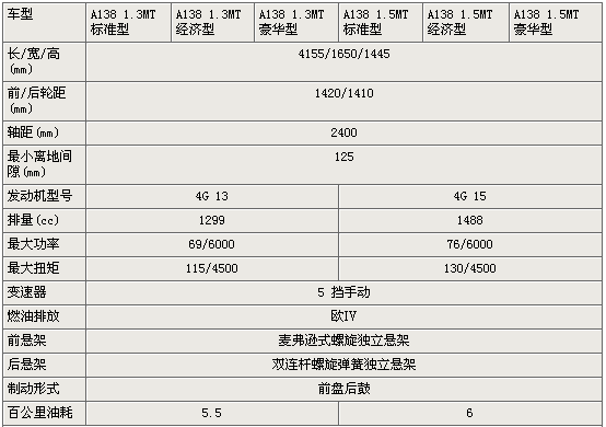 江淮138車身長4155mm,與陸風(fēng)風(fēng)華轎車尺寸基本相當(dāng)。動力方面,采用技術(shù)成熟可靠的三菱4G13與4G15發(fā)動機(jī),排量為1.3L與1.5L,排放為歐IV標(biāo)準(zhǔn),百公里油耗最低為5.5升,搭載5擋手動變速器。前后懸架均為獨(dú)立懸架,乘坐的舒適性將能滿足乘員需求。