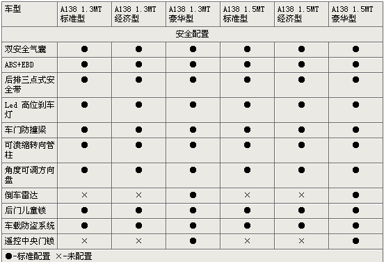 在安全配置方面,A138新車除了裝備前雙安全氣囊之外,還有ABS+EBD主動配置保證安全,同時(shí)車門防撞鋼梁、可潰縮轉(zhuǎn)向管柱都為乘員提供更多的保護(hù)。而倒車?yán)走_(dá)、遙控中央門鎖只在高配的豪華型才有裝備。