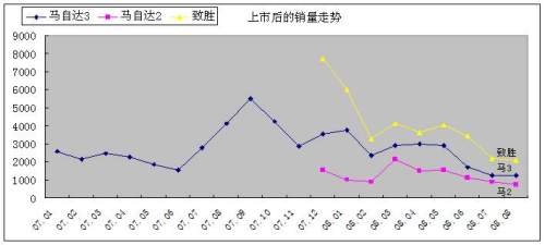 由圖可見,無論是馬3、致勝或者馬2,在上市后都能取得不錯(cuò)的銷量,也就是說市場(chǎng)能持續(xù)一段時(shí)間的良好反應(yīng)。這說明了這些新款車型在一開始是被市場(chǎng)認(rèn)可的,其產(chǎn)品和品牌的號(hào)召力都足夠強(qiáng)大,但隨著市場(chǎng)競(jìng)爭(zhēng)的加劇,無論是B級(jí)的致勝、還是A的馬3和A0級(jí)的馬2均出現(xiàn)持續(xù)的銷量下滑,這其實(shí)綜合的反應(yīng)了長(zhǎng)安福特的產(chǎn)品缺乏持續(xù)的市場(chǎng)競(jìng)爭(zhēng)力的問題。