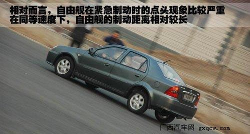 相對于夏利N5和新羚羊,自由艦在緊急制動時的點頭現(xiàn)象比較嚴重,駕駛員在車內(nèi)會有明顯“下扎”的感覺。在同等速度下,自由艦較重的車身會帶來更多的慣性,使制動距離相對較長。