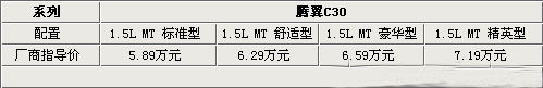 為體現(xiàn)精品超值,騰翼C30的各車型最低配置突出代步工具的實惠。舒適型配置都有全鋁VVT發(fā)動機、雙安全氣囊、ABS+EBD、四輪盤剎、CD+Mp3、四門電動車窗、安全帶未系報警、車門未關(guān)報警系統(tǒng)、鑰匙未拔報警系統(tǒng)及發(fā)動機電子防盜。而最高配置面對精英用戶,則有電動天窗、真皮電加熱座椅、自動空調(diào)等,更是體現(xiàn)了騰翼C30的精品形象。