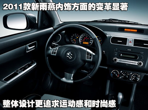 除以上主要革新特點(diǎn)外,雨燕2011款還通過對空調(diào)出風(fēng)口增加銀色裝飾件、雙色搭配時尚門板等多項升級,增加了內(nèi)飾的運(yùn)動氣息和更加飽滿的美感。