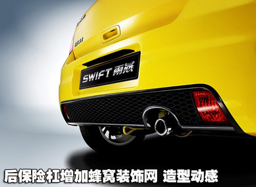雨燕2011款車身新增了前后運(yùn)動包圍和空氣動力學(xué)側(cè)圍裙邊。新款側(cè)圍裙邊擁有出色的空氣動力學(xué)表現(xiàn),讓車輛高速行駛時擁有更加出色的操控和穩(wěn)定感。運(yùn)動側(cè)圍裙邊的應(yīng)用讓雨燕更加硬朗,充滿了對運(yùn)動激情的渴求。同時,后保險杠也相應(yīng)增加了蜂窩狀裝飾,為尾部增添了濃郁的賽車風(fēng)格。與前保險杠蜂窩狀裝飾和諧一體,讓整車包圍更具陽剛之氣,富有激情。