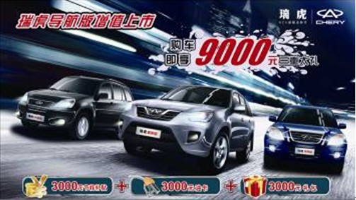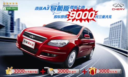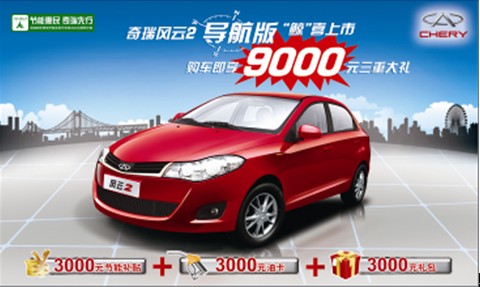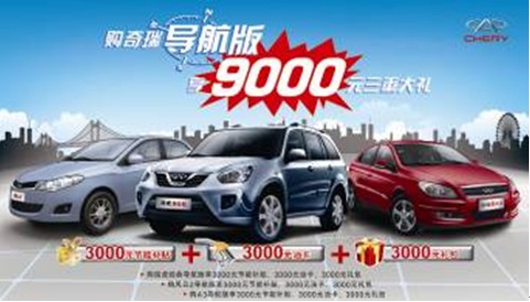 “陽春布德澤,萬物生光輝!苯,記者在當(dāng)?shù)仄嫒鸾?jīng)銷商處了解到,目前奇瑞4S店正在開展奇瑞導(dǎo)航版促銷活動。推出的導(dǎo)航版車型有瑞虎、奇瑞A3、風(fēng)云2三款不同級別車型供消費(fèi)者選擇,涵蓋SUV、緊湊型車、A0級車三種類型,裝備的智能導(dǎo)航集DVD、GPS、倒車影像、車載藍(lán)牙等多項高科技功能于一身。另外,凡在活動期間購買奇瑞導(dǎo)航版任意一款車型的消費(fèi)者,即可享受9000元三重大禮優(yōu)惠,包含3000元節(jié)能補(bǔ)貼+3000元油卡+3000元禮包,優(yōu)惠力度頗大。
