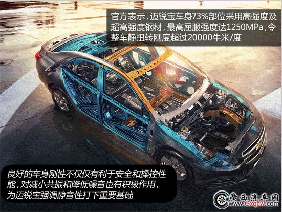 “邁銳寶采用BFI一體化車身架構(gòu),車身73%部位采用高強(qiáng)度及超高強(qiáng)度鋼材,最高屈服強(qiáng)度達(dá)1250MPa,令整車靜扭轉(zhuǎn)剛度超過(guò)20000牛米/度”,這是官方宣傳稿上的一段話,對(duì)于它的車身剛性雖然我無(wú)法考究真實(shí)性,想必大家不用過(guò)多懷疑,來(lái)自相同平臺(tái)的君威的操控性已經(jīng)廣受好評(píng)了,邁銳寶自然也不會(huì)差到哪里,盡管它并不像君威那樣標(biāo)榜運(yùn)動(dòng)。