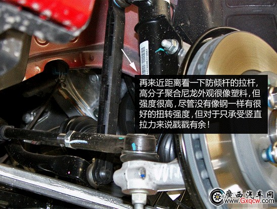邁銳寶做了很多輕量化的工作,鋁合金擺臂就是其中之一,同時(shí),防側(cè)傾支桿也采用高分子聚合尼龍,它很輕摸起來(lái)像塑料但事實(shí)上強(qiáng)度很高,承受防側(cè)傾桿支桿這樣的縱向力是綽綽有余了。