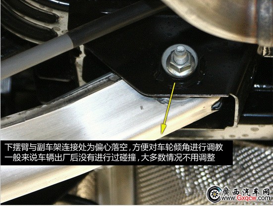 在下擺臂與副車架的結(jié)合處使用了一個(gè)偏心螺母,方便對(duì)車輪的外傾角做出調(diào)整,工程師表示,一般車輛在不發(fā)生碰撞的情況下基本無(wú)需做四輪定位。