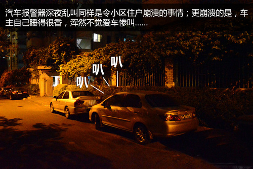 除了深夜鳴喇叭惹人厭外,汽車報(bào)警器深夜擾民也是很令小區(qū)居民頭痛的現(xiàn)象。晚上停放在小區(qū)的汽車很多,一些安裝了報(bào)警器的汽車,被小貓小狗輕輕一碰,或附近的聲音稍微大些,就會(huì)叫個(gè)不停,在深夜聽見那急促刺耳的聲音,簡直讓人崩潰。