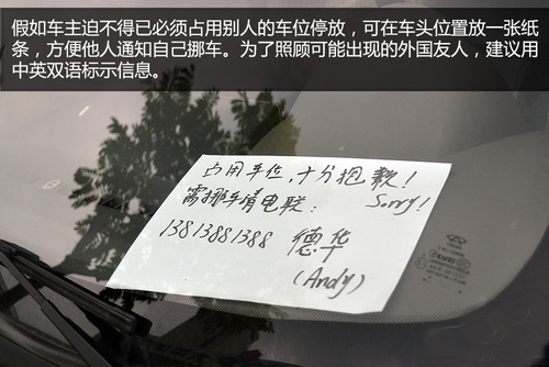 解決方法:這種行為同樣要靠車主自覺,時(shí)刻提醒自己要做一名有素質(zhì)的車主,損人利己的事情干多了,遲早遭報(bào)應(yīng)。假如車主實(shí)在沒有辦法,只能冒著被人砸車的風(fēng)險(xiǎn)將車停在小區(qū)內(nèi)的禁停區(qū),也別忘了在車窗顯眼位置附上一張紙條,寫上自己的姓名和聯(lián)系方式,還有抱歉的話。這樣做,既能讓別人及時(shí)通知你挪車,也能讓人消消氣,把負(fù)面影響降至最低。