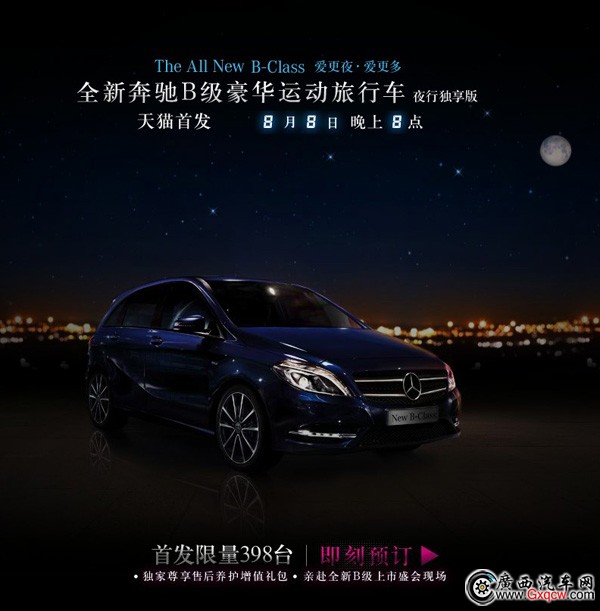 2012年8月8日,奔馳全新B級(jí)“夜行獨(dú)享版”車型在天貓商城正式發(fā)布,并通過天貓商城出售預(yù)定名額。新車僅限量發(fā)售398臺(tái),預(yù)購(gòu)名額從8月8日20點(diǎn)開始搶拍,起拍價(jià)格為999元。奔馳全新B級(jí)“夜行獨(dú)享版”的正式售價(jià)在36萬(wàn)元左右,正式上市時(shí)間為8月30日的成都車展。奔馳該車型僅在天貓線上獨(dú)享,通過預(yù)購(gòu)活動(dòng)成功購(gòu)車的客戶,將獲得“售后養(yǎng)護(hù)增值禮包”。然而,在短短不到3小時(shí)的時(shí)間內(nèi),398臺(tái)奔馳全部售罄。