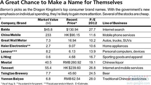 此次《巴倫周刊》根據(jù)公司股價(jià)和業(yè)績表現(xiàn),評選出中國十大消費(fèi)品牌,以帶讀者瀏覽中國本土品牌的新興陣容。按照英文名稱字母順序,分別為:百度;中國移動;長城汽車;海爾電器;聯(lián)想;李寧;茅臺;騰訊;青島啤酒;云南白藥。上榜的汽車品牌只有長城一家。