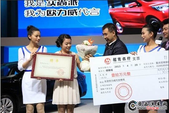 一襲清爽的白色連衣裙,搭配復(fù)古盤發(fā),歐力威以“十萬日薪”身價征得的形象代言人終于在上海車展上亮出了真身,她就是來自南京的時尚辣媽胡雅煊。華麗的展臺,酷炫的舞蹈,再加上“十萬日薪”代言人的靚麗登場,使得長安汽車展臺成為此次車展中的一抹亮色;顒赢斕,長安汽車商用車事業(yè)部副總經(jīng)理楊大勇為這位代言人頒發(fā)了聘用證書,并送上了代言支票。據(jù)悉由胡雅煊主演的微電影《路口》,即歐力威形象宣傳片已制作完成并已投放各大視頻網(wǎng)站。