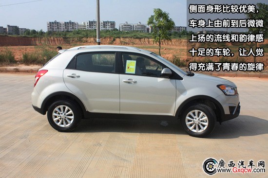 從車子的側(cè)面來(lái)看,可以發(fā)現(xiàn),車子整體的身形還是比較優(yōu)美的,車身上由前到后微微上揚(yáng)的流線和韻律感十足的車輪,讓人覺(jué)得充滿了青春的旋律。雖然車的個(gè)頭不是很高,但是足以展現(xiàn)緊湊型SUV的運(yùn)動(dòng)潛質(zhì)。雙龍柯蘭多軸距為:2650mm,作為一款緊湊型SUV,這個(gè)長(zhǎng)度還是有一定的可比性的,比新勝達(dá)稍短,比指南者稍長(zhǎng)。
