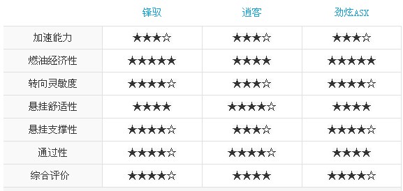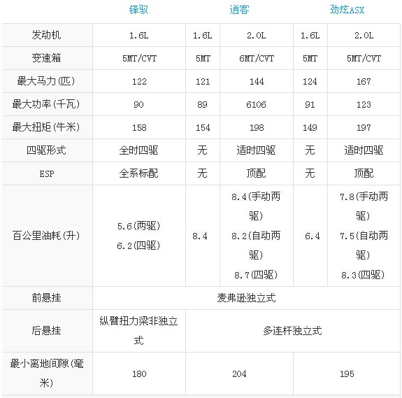逍客和勁炫ASX均提供了1.6升和2.0升兩種自然吸氣發(fā)動(dòng)機(jī)的動(dòng)力選擇,變速箱也均使用了手動(dòng)和CVT的組合,稍有不同的是,逍客的2.0升車型采用了6速手動(dòng)變速箱。和鋒馭不同的是,逍客和勁炫ASX都使用了多連桿式的獨(dú)立后懸掛,但1.6升車型均無四驅(qū)功能,且四驅(qū)形式均為適時(shí)四驅(qū),相較鋒馭的全時(shí)四驅(qū),四驅(qū)能力似乎顯得不夠強(qiáng)大。既然我們是對(duì)比,出于公平以及文章現(xiàn)實(shí)意義的考慮,我們只對(duì)1.6升車型進(jìn)行對(duì)比,下文中若無特殊說明,所說的逍客和勁炫ASX均指其1.6升的版本。