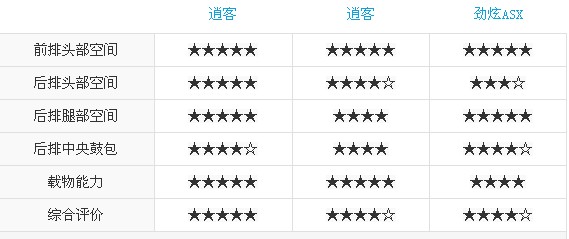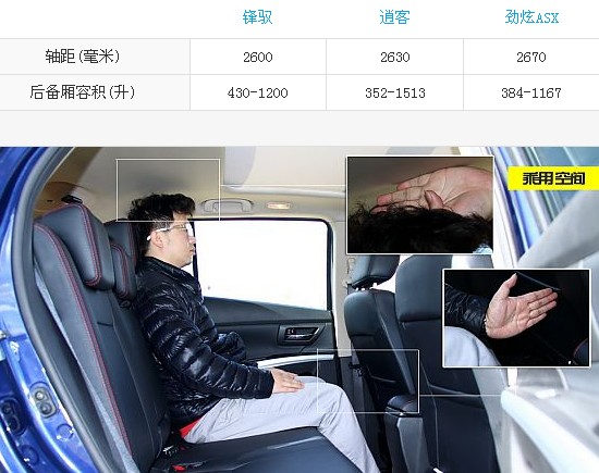 小結:空間的表現(xiàn)讓我們大呼上當,車身尺寸相對小的鋒馭不但有著很好的后備箱容積,內部的乘坐空間也只好不差。逍客的后排腿部空間比較遺憾,盡管說1拳的距離也夠用,但距離舒適還是有一些差距。勁炫ASX空間表現(xiàn)很平淡,三車中就屬它的車身高度最高,但后排乘客的頭部空間卻很局促。從配置方面來看,在考慮到市場優(yōu)惠的前提下,鋒馭和逍客的配置水準相當,鋒馭由于標配了ESP,并且新車暫無優(yōu)惠,整體配置水準比逍客稍高一點。勁炫ASX的中低配車型配置較簡單,高配車型則一應俱全,如果只是在15萬元以內選擇的話,勁炫ASX競爭力還有待加強。