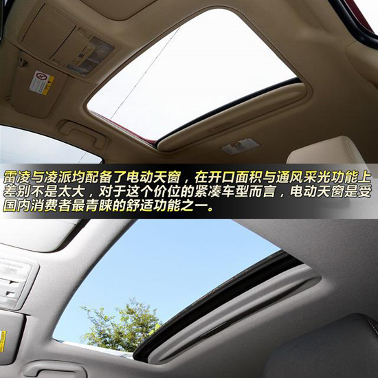 雷凌與凌派均配備了電動天窗,在開口面積與通風采光功能上差別不是太大,對于這個價位的緊湊車型而言,電動天窗是受國內(nèi)消費者最青睞的舒適功能之一。