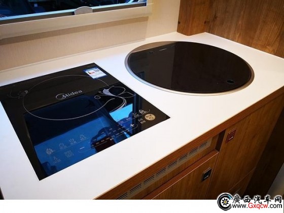 廚房搭配電磁爐,進(jìn)口帶蓋水槽和折疊式水龍頭,頂排式抽油煙機(jī),功能已經(jīng)是十分家居化了,如果是油煙特別大的廚房活動,還是建議到車外進(jìn)行比較合適