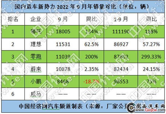 國慶假期也沒有打亂國內(nèi)造車新勢力發(fā)布“成績單”的節(jié)奏。10月第一天,5家國內(nèi)造車新勢力陸續(xù)公布9月銷量。數(shù)據(jù)顯示,9月,哪吒、理想、零跑、蔚來和小鵬的銷量分別為18005輛、11531輛、11039輛、10878輛、8468輛,同比分別增長134%、62.5%、200%、2.35%、-18.7%;前三季度的累計銷量分別為111190輛、86927輛、87602輛、82434輛、98553輛,同比分別增長168%、57.27%、299.33%、24.15%、75%。