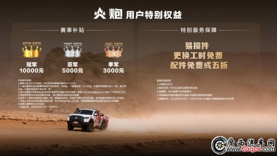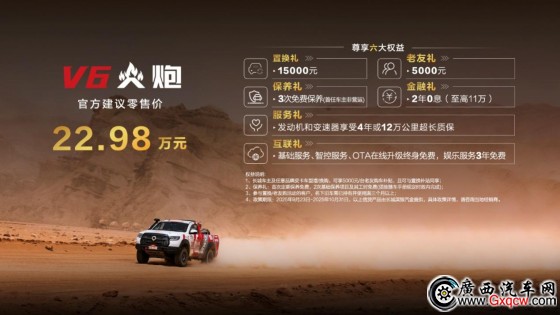 9月,賽級(jí)皮卡V6火炮正式上市,官方建議零售價(jià)22.98萬元,并同步推出15000元置換禮、5000元老友禮等六大權(quán)益。為滿足廣大用戶的需求和呼聲,凡駕駛V6火炮參加規(guī)模超過100臺(tái)賽車的政府舉辦的賽事,將給予冠亞季軍3000-10000元賽事補(bǔ)貼;同時(shí),為降低車友玩車成本,針對(duì)火炮首任車主,一年內(nèi)因越野、玩沙場(chǎng)景損壞更換的易損件,更換工時(shí)免費(fèi),部分配件按市場(chǎng)指導(dǎo)價(jià)免費(fèi)或五折提供。