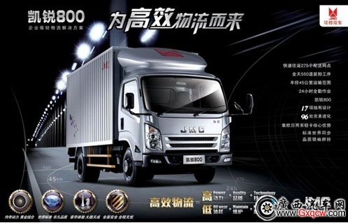 2013年中旬江鈴汽車重磅推出全新一代高端輕卡——凱銳800,凱銳800是在福特體系的滋潤下,江鈴?fù)ㄟ^自主研發(fā),集中美日韓等國專家智慧推出的全新輕卡平臺產(chǎn)品,也是國內(nèi)輕卡領(lǐng)域目前最為高端的產(chǎn)品。體現(xiàn)了江鈴與五十鈴、福特多年合作精華的積累沉淀與吸收創(chuàng)新,是歐日美輕型商用車的集大成之作,更是為國內(nèi)城市物流市場量身訂做的一款物流利器。