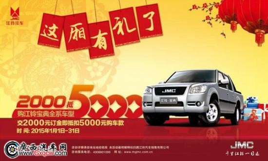 春節(jié)將至,購車高峰也隨之而來。值此之際,江鈴汽車為滿足市場需求,降低購車成本,特大范圍開展了“訂購寶典全系車型交2000元定金抵交5000元購車款優(yōu)惠促銷活動”。此次促銷讓購車者享受到最實在的優(yōu)惠。有購車需求的朋友,時機難得,還不趕快行動?經(jīng)銷商熱線:0771-3800599.