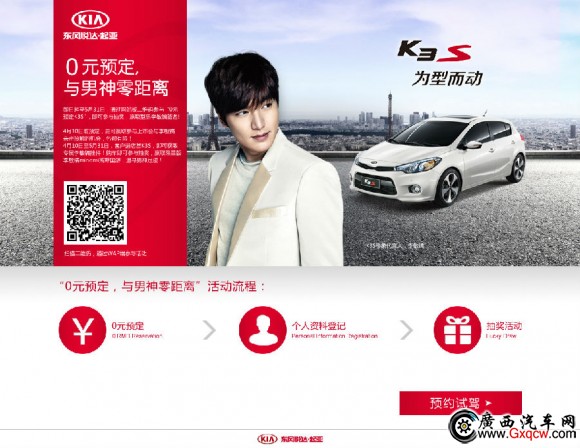 活動期間,參與客戶將享受雙重禮遇。一、線上預定有禮:即日起至2014年5月31日,通過網站或掃描二維碼參與“0元預定K3S”,可抽獎贏取參與K3S上市會與李敏鎬親密接觸的機會(僅4月10日前)或李敏鎬親筆簽名照片,名額有限!憑線上預定交易碼至店成功購車還可參與抽獎贏取限量版李敏鎬minomi玩偶或韓國游;二、來店賞車有禮:2014年4月10日至2014年5月31日,進店賞車,即可獲贈K3S專屬李敏鎬掛飾。