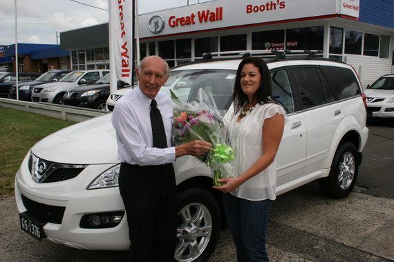 圖為蓋伊•福利自長(zhǎng)城汽車(chē)展位凱文經(jīng)理那里,拿到了她的新車(chē)鑰匙與一束鮮花,以此來(lái)紀(jì)念在澳大利亞售出第20000長(zhǎng)城汽車(chē)的這一刻