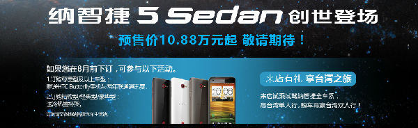 7月25日前訂購(gòu)納智捷5sedan即可獲贈(zèng)價(jià)值千元冷熱杯架一個(gè)(車載冷熱飲科技體驗(yàn)),購(gòu)尊貴版以上車型版獲贈(zèng)價(jià)值4640元HTC Butterfly 智能手機(jī)(含SIM卡及免費(fèi)使用2年呼叫中心平臺(tái)服務(wù))一部!,來(lái)店有禮享臺(tái)灣之旅,歡迎大家來(lái)館參觀體驗(yàn),我們捷誠(chéng)為您安排專人專業(yè)銷售顧問(wèn)帶您一起體驗(yàn)納智捷南寧捷誠(chéng)汽車生活館與其他汽車4S店的不同科技魅力,讓您享受超快感的買車過(guò)程,贏臺(tái)灣單人游,購(gòu)車再贏臺(tái)灣雙人游!