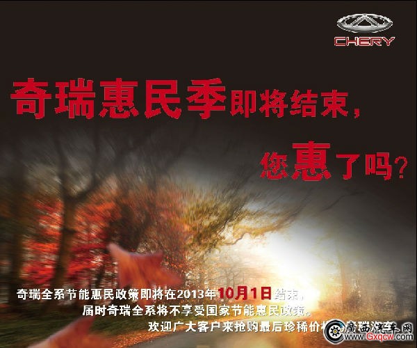 據(jù)悉現(xiàn)行的節(jié)能汽車(chē)補(bǔ)貼政策到9月30日即將結(jié)束,這意味著客戶在10月1日以后購(gòu)1.6L一下排量的車(chē)型,將會(huì)多支付3000元現(xiàn)金。為了回饋廣大新老客戶,廣西鑫廣達(dá)奇瑞旗艦店攜旗下8店感恩回饋,9月28日惠民政策*后的瘋狂――總經(jīng)理底價(jià)簽售會(huì)!9月28日活動(dòng)當(dāng)天奇瑞全系車(chē)型價(jià)格將大幅度優(yōu)惠!優(yōu)惠力度空前!更有總經(jīng)理現(xiàn)場(chǎng)簽售!