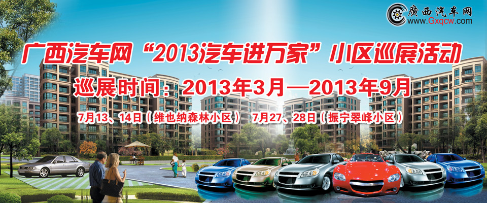 7月13、14日(本周末)下午15時至21時,廣西汽車網(wǎng)“2013汽車進萬家”小區(qū)巡展活動在維也納森林小區(qū)英雄廣場隆重舉行,奔馳、寶馬、奧迪、本田、標致、斯柯達、菲亞特、斯巴魯、奔騰、江鈴、東南汽車等20多款熱銷車型現(xiàn)場同掀“冰點團購狂潮”!