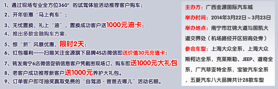 本次主題取之“驚折”,本次活動金源汽車城以“驚人的折扣”來驚醒南寧車市,同時,進(jìn)入春季在人們開始忙碌之際,金源汽車城為愛車人士提供多方位關(guān)愛服務(wù),比車主您更關(guān)愛您。